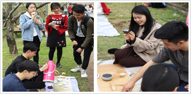 茗茶会上,有清新淡雅的白毫银针,芬芳馥郁的茉莉花茶,味甘形美的西湖龙井,细腻醇和的正山小种,最受欢迎的要数武夷山的肉桂。学习交流气氛浓郁,同学们通过茶会去理解中国的茶道灵魂:和、静、怡、真,通过交流将课堂所学的理论知识付诸深刻的感官认识,进一步提升学习成效。