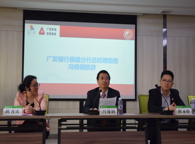 3月21日下午,“广发银行希望工程脱贫攻坚助学金”颁发仪式在资源与环境学院田家炳611会议室举办。广发银行福州分行办公室总经理助理冯锡钢、团委书记赵圆、福建省青少年发展基金会福建省希望工程办公室副主任陈永晓,资源与环境学院党委副书记(主持工作)陈月霄,校学工部副部长苏开敏以及校团委老师、资源与环境学院受助学生及师生代表参加仪式。会议由校团委直属分团委书记周颖华主持。