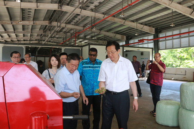 韩长赋部长一行还先后视察了示范中心的菌草种苗和种植基地,参观了菌草青贮饲料加工以及菌草菇生产线,了解中心运行的成果。我校国家菌草中心首席科学家林占熺研究员全程陪同并就有关问题作了讲解。视察中,韩长赋部长详细了解了菌草的特性和作用,细致地察看了菌草与当地牧草对比种植试验现场。马亨德拉·雷迪部长十分钦佩地说:“菌草技术已被提到斐济国家级层面,列为斐济农业部五项新举措之一;菌草技术在斐济的成功实施,是中国的一个骄傲,感谢中国政府。”韩长赋部长微笑地回答:“援斐菌草技术示范中心项目的成功是中斐两国共同努力的成果,菌草技术项目也是中斐友好合作的典范!我很愿意与部长您一道支持这个项目,把菌草产业做得更大、更好,造福更多的斐济人民及南太周边岛国。”