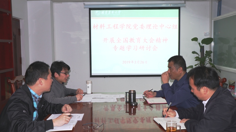 3月26日下午,材料工程学院党委理论中心组在学院会议室召开全国教育大会精神第一场专题学习讨论会。会议以“学习习近平总书记有关立德树人重要讲话精神”为主题,由学院党委副书记曹滨斌为主讲进行学习讨论。学院党委书记陈建辉主持学习会。