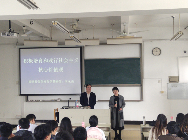 3月27日,为切实落实好习近平新时代中国特色社会主义思想大学习领航计划系列主题活动,马克思主义学院刘新玲名师工作室和中共党史读书社邀请了中共福建省委党校李永杰教授,给党史读书社师生及18级机械班的同学进行“培育和践行社会主义核心价值观”的主题宣讲。
