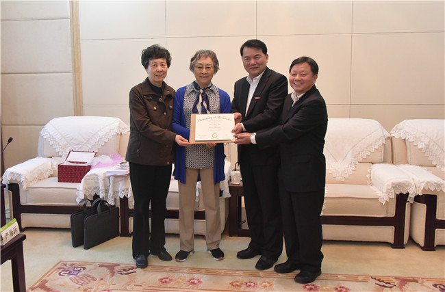 座谈会后,严隽琪家人向学校赠送了省立农学院第一届毕业生于1943年送给严家显先生的纪念品以及严家显先生赴美留学的博士毕业证书和毕业论文。