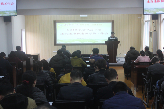 4月4日下午,管理学院召开2018年度中层干部述责述廉和述职考核工作会,学院党委书记谢志鸣主持了会议,学院领导班子成员及教职工代表近80人参加了会议,校2018年度全面从严治党主体责任暨意识形态工作责任制落实情况第四检查组组长余新然,成员苏开敏、林敬平到会指导。