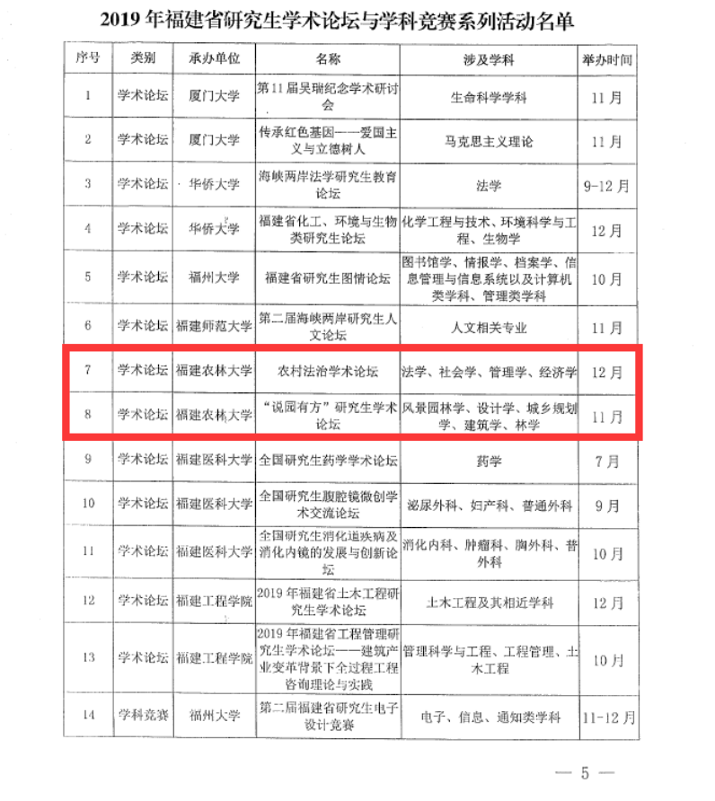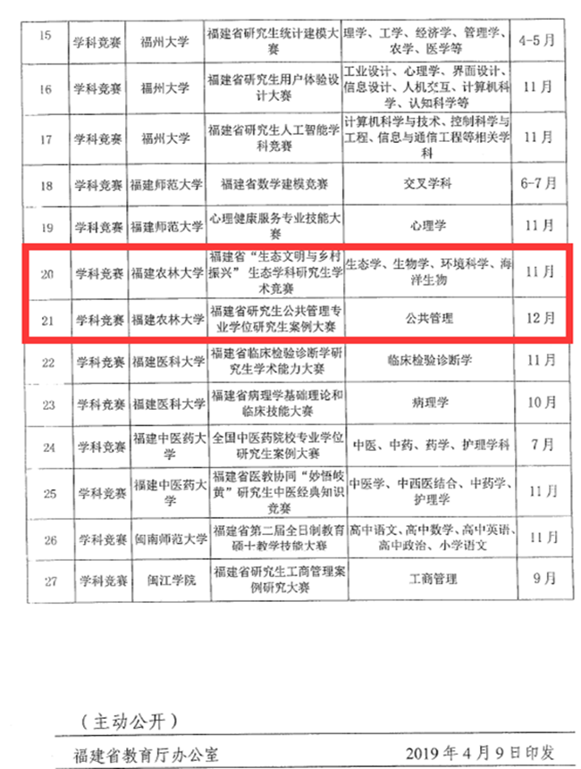 近日,福建省学位委员会办公室发布《关于举办2019年福建省研究生学术论坛和学科竞赛系列活动的通知》(闽学位办﹝2019﹞2号),我校申报的4个项目(2场学术论坛和2个学科竞赛)获批。获批项目分别为:文法学院的“农村法治学术论坛”、艺术园林学院的“‘说园有方’研究生学术论坛”、生命科学学院的“福建省‘生态文明与乡村振兴’生态学科研究生学术竞赛”和公共管理学院的“福建省研究生公共管理专业学位研究生案例大赛”。2019年我省共有10所高校承办省级研究生学术论坛13场和学科竞赛14个。截止目前,我校共获批了5个项目。