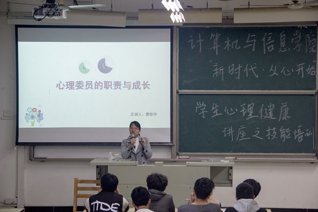 4月11日,计算机与信息学院在创新楼113举行“新时代,从‘心’开始”心理技能培训讲座。本次活动由计算机与信息学院辅导员、国家三级心理咨询师黄珍华老师主讲,共有70余名学院2017级心理委员及心理信息员参加本次讲座。