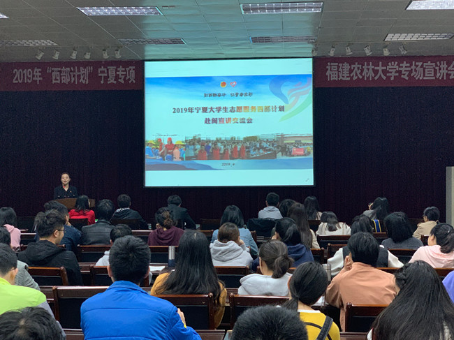 为深入贯彻闽宁合作协议,做好2019年宁夏大学生志愿服务西部计划招募宣传工作,4月11日上午,2019年宁夏大学生志愿服务西部计划赴闽交流会在我校多功能厅举行,我校各学院应届毕业生约120人参加。