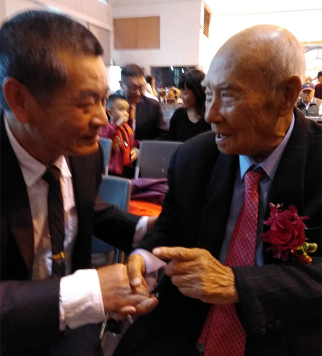 我校台湾校友会副会长周张德堂先生向贡谷绅校友祝贺