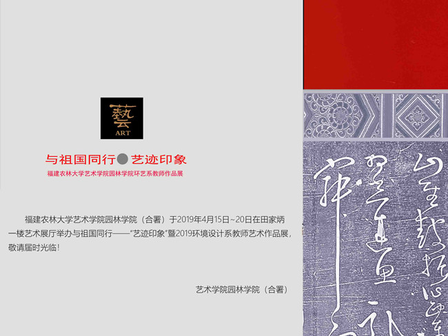 4月15日至20日,为庆祝中华人民共和国成立70周年,我校艺术学院园林学院(合署)在田家炳一楼艺术展厅举办 “与祖国同行——‘艺迹印象’暨2019年环境设计系教师艺术作品展”,作为新中国成立70周年的献礼。