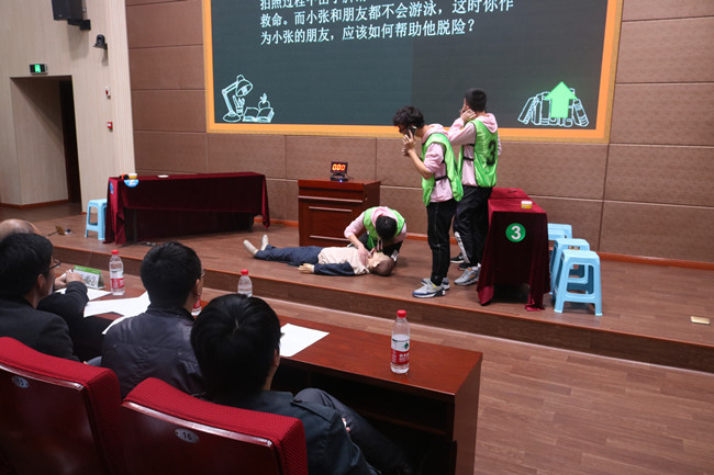 比赛经过初赛、复赛,从报名的46支队伍选拔出8支优秀的队伍进入决赛。决赛分为三个环节,第一环节抢答赛的形式,题目涵盖国家安全、校园安全、食品安全、网络安全等方面的知识,四支队伍成功晋级下一环节。第二环节考察同学遭遇紧急状况和突发事件是否能够采取正确应对措施。每支队伍抽取一道情景题,由演员现场演示事故情景后选手们再上台根据题中所给的信息上台进行情景模拟操作,题目包括心肺复苏急救题、宿舍消防安全题、防诈骗题等。该环节使安全教育与实际案例相结合,让同学们在观看表演过程中学习安全知识,现场气氛活跃,爆发阵阵掌声。第三环节中,两支队伍结合最近的热点“福州赵宇见义勇为案件”就“见义勇为应该奋不顾身还是奋而顾身”展开辩论,最终反方灰队以略微优势压倒绿队,获得了本次大赛的总冠军。