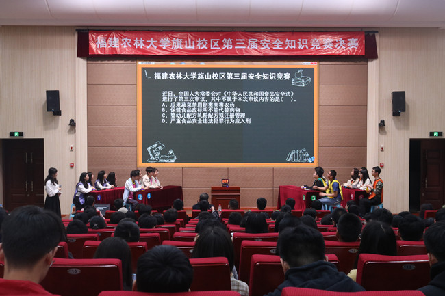 4月16晚,旗山校区第三届安全知识竞赛决赛于旗山校区小报告厅举行。旗山校区管委会(筹)副主任肖志斌、范胜龙,省第三人民医院原急诊科主任陈少强,校学生处郑智彬,校保卫处黄锦湖老师担任了决赛评委。旗山校区管委会和校区两个学院的师生240余人一同观看了比赛。