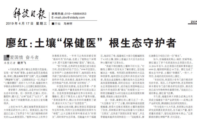 4月17日,《科技日报》3版“爱国情 奋斗者”专栏刊登《廖红:土壤“保健医” 根生态守护者》,文章转载如下: