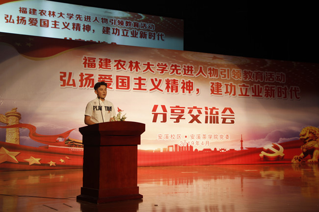 4月11日下午,安溪校区•安溪茶学院党委举办 “弘扬爱国奋斗精神,建功立业新时代”先进人物引领教育分享交流会。会上,来自校区各党支部、团支部的十五名优秀师生代表结合观看《榜样3》、《塞罕坝生态文明建设范例启示录》和“感动中国人物颁奖典礼”等先进人物事迹的感悟与学习心得,结合自身实际,依次作了主题分享发言。高水练老师说:“教师要克己奉公,课内、课外,为教育事业尽一份力量,培养一代人。”李嘉莉同学认为:“青年一代要高举中国特色社会主义伟大旗帜,认真贯彻习近平新时代中国特色社会主义思想,不忘初心,与榜样同行,与人民同在。”少数民族预科班萨米尔·赛力肯同学分享道:“向李元敏同志学习,爱护民族团结,就像爱护我们的眼睛一样。”各师生代表分享完毕后,校区·学院党委副书记李治洲宣读了《关于表彰开展先进人物引领教育活动先进个人的决定》,对开展先进人物引领教育活动中表现优秀的师生予以表彰。