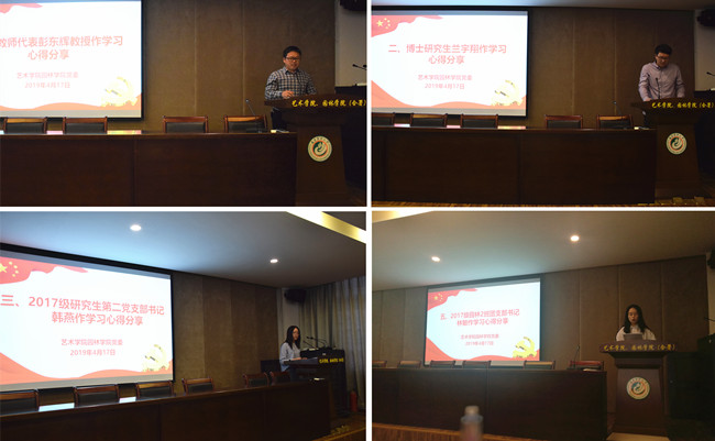 4月17日下午,艺术学院园林学院党委召开先进人物引领教育活动交流分享会。会上,园林系主任彭东辉教授、2017级研究生第二党支部书记韩燕、2017级园林2班团支书林敏、博士研究生兰宇翔、2015级环境设计专业本科生刘悦等五名学院优秀师生代表结合个人成长经历、今后的努力方向就学习先进人物引领教育活动心得体会作典型发言。活动最后,学院党委书记陈为德强调,学院广大师生要在学习先进人物引领教育活动中,进一步深化对新思想的学习领会,牢记“弘扬爱国奋斗精神、建功立业新时代”的责任与担当。他还提出了四点希望:一要以先进人物为榜样,不断增强为国服务的本领。作为教师,要以立德树人为根本任务,做好教书育人工作。作为学生,要树远大理想、立鸿鹄志,做奋斗者,努力使自己成为德智体美劳全面发展的社会主义建设者和接班人。二要主动担当作为,汲取榜样的力量,发挥专业优势积极投身到服务乡村振兴战略的行动中。三要弘扬爱国爱校情怀,坚定理想信念,增强“四个意识”,争当民族复兴大任的时代新人。四要充分发挥党支部的主体作用,进一步规范落实党支部“三会一课”制度,创新性开展主题党日活动,发挥广大党员的先锋模范带头作用,强化支部的战斗堡垒作用。