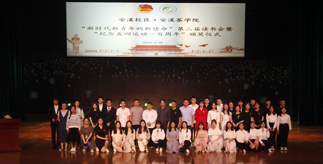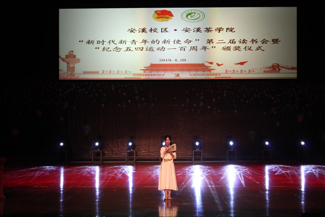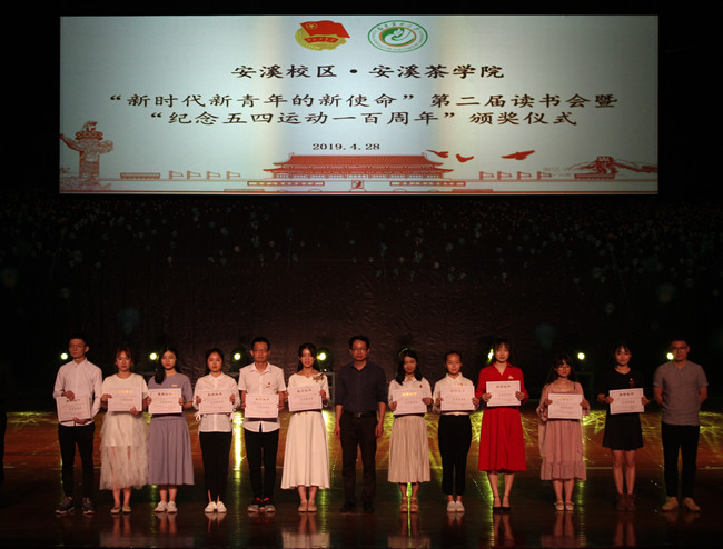 为弘扬“五四”精神,4月28日晚,安溪校区·安溪茶学院“新时代新青年的新使命”第二届读书会暨“纪念五四运动一百周年”颁奖仪式于校区明德报告厅举行。安溪校区·安溪茶学院党委书记雷国铨,党委副书记黄成茂、李治洲,学工部部长纪文元,团委书记王刚,新疆内派辅导员范钰,校区辅导员老师以及团员代表、主要学生干部等近八百人参加了此次活动。