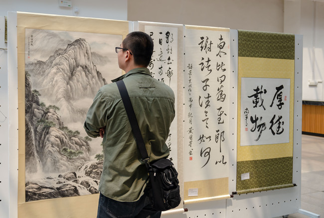 展会现场,同学们围绕在作品周围,感受书画的魅力。前来参展的机电工程学院2017级车辆工程周佳炜同学说道:“看到现场的书法作品后,我从中感受到书写人的心境,对中华文化的瑰宝有了更深入的了解。”“艺术贵在变化。”书法作品《为有牺牲多壮志,敢教日月换新天》的书写者陈光斌如是说:“好的书法作品,字要越看越有韵味,而不是一览无遗”。另一名书写者陈恒华用书法作品《不忘教育初心,方得树人始终》表达了自己对新时代的理解和对当代教育者的希望。