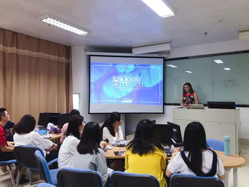 会后,Amy Braye女士和来学院授课的圣文森山大学酒店管理专业课程负责人Candace Blayney副教授在综合楼B506教室为学院首批赴加留学学生进行行前答疑,耐心细致地解答了同学们的疑问。Amy Braye女士详细介绍了圣文森山大学办学情况、住宿和接机安排、奖学金和兼职实习工作等方面情况。Candace Blayney副教授详细介绍了赴加留学所需完成的课程项目及选课流程等。