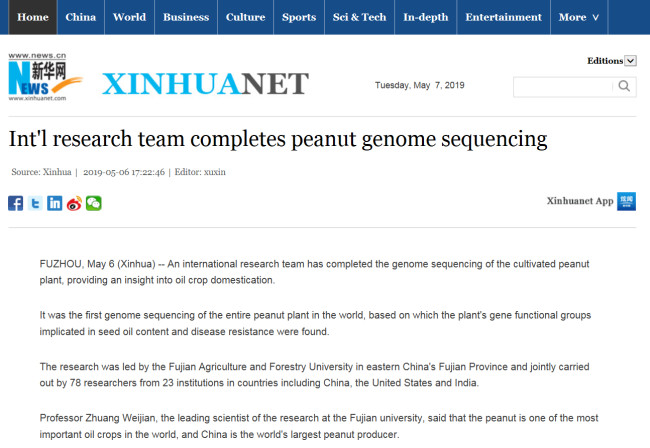 This is a major breakthrough in peanut genetic research around the world. It will benefit not only China but the world as a whole, said Rajeev K. Varshney, a researcher at the International Crops Research Institute for the Semi-Arid Tropics in India and one of the authors of the paper.