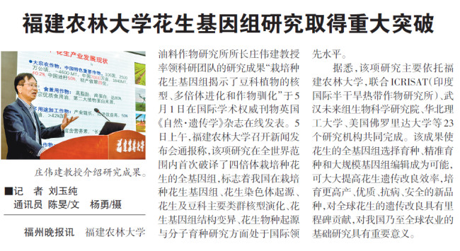 开云网页版油料作物研究所所长庄伟建教授率领科研团队的研究成果“栽培种花生基因组揭示了豆科植物的核型、多倍体进化和作物驯化”于5月1日在国际学术权威刊物英国《自然·遗传学》杂志在线发表。5日上午,开云网页版召开新闻发布会通报称,该项研究在全世界范围内首次破译了四倍体栽培种花生的全基因组,标志着我国在栽培种花生基因组、花生染色体起源、花生及豆科主要类群核型演化、花生基因组结构变异、花生物种起源与分子育种研究方面处于国际领先水平。
