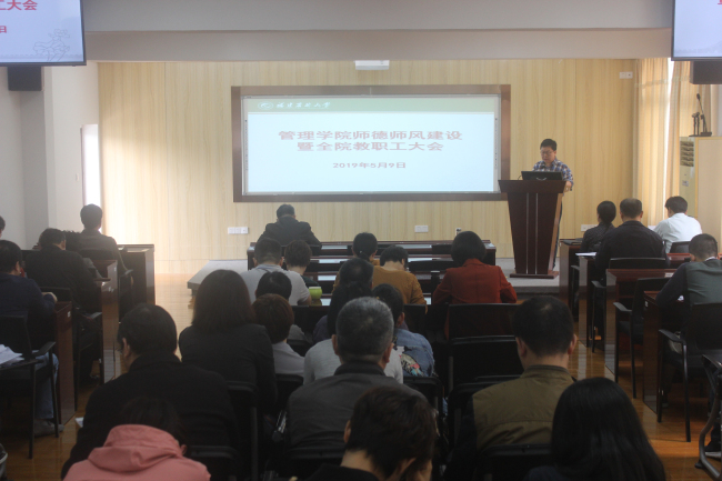 5月9日下午,管理学院召开师德师风建设暨全院教职工大会,学院领导班子成员出席会议,学院党委书记谢志鸣主持会议。