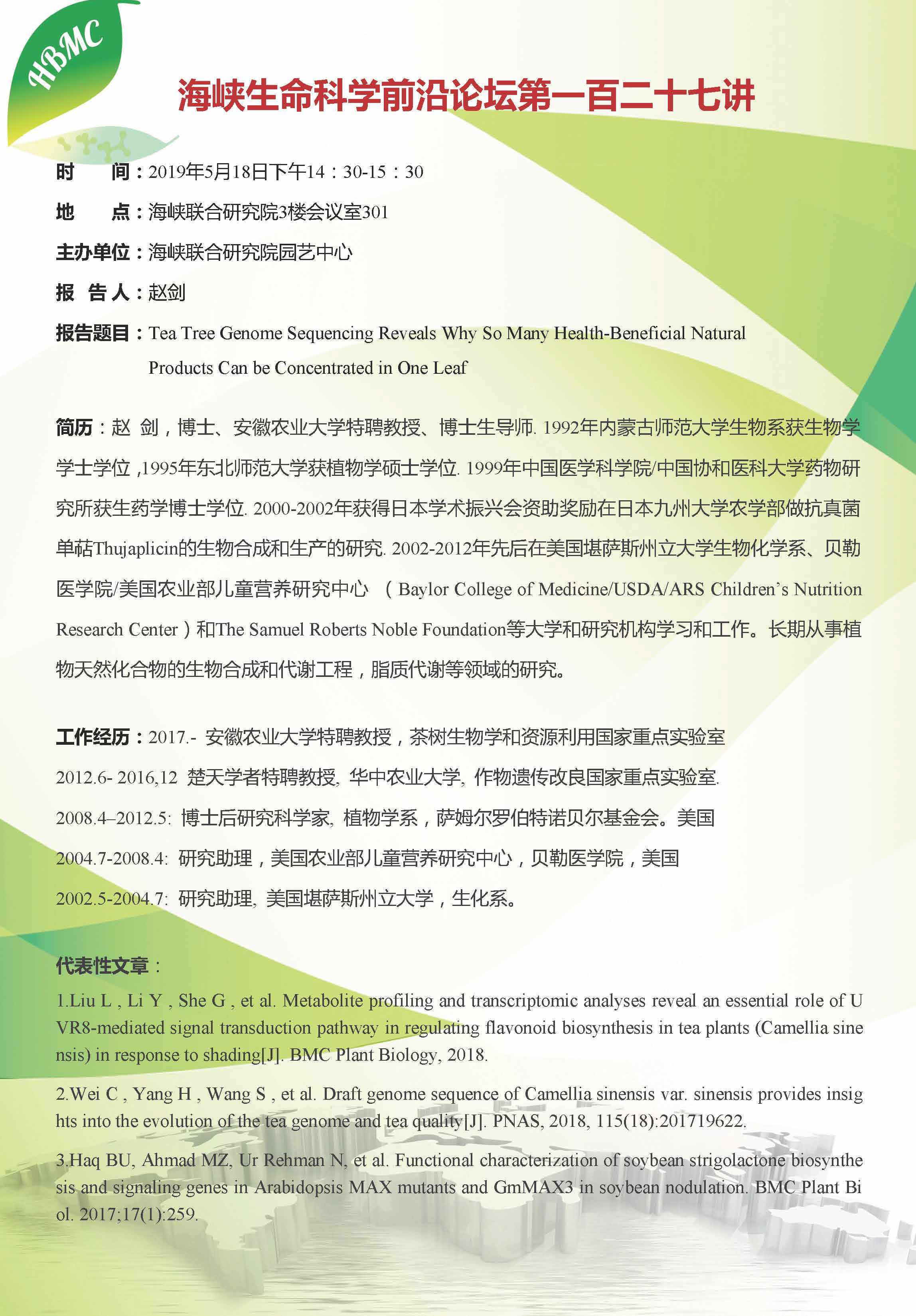 海峡生命科学前沿论坛第127讲(2019.5.18)-Tea Tree Genome Sequencing Reveals Why So Many Health-Beneficial Natural Products Can be Concentrated in One Leaf