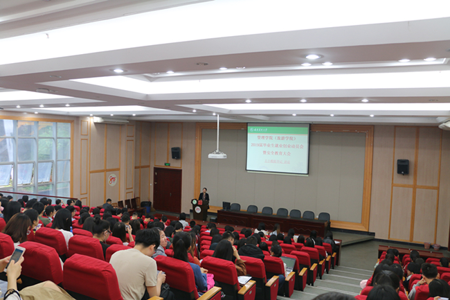 5月10日上午,管理学院2019届毕业生就业创业动员会暨安全教育大会在李常盛学术报告厅举行,院党委副书记王小榕、毕业班辅导员陈发川及全体在校毕业生参加。