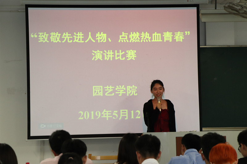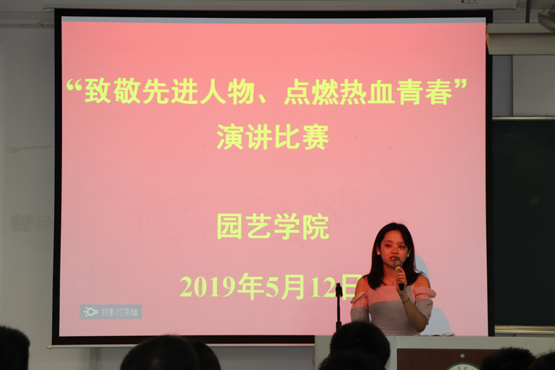5月12日晚上,园艺学院在田家炳楼201教室举办“致敬先进人物、点燃热血青春”主题演讲比赛,辅导员叶一江、郑端生和各年级学生代表共计80人到场聆听。