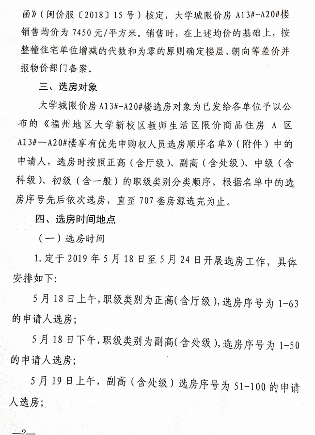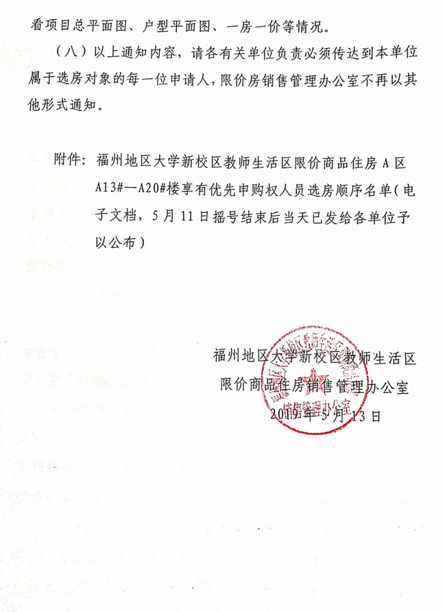 福州地区大学新校区教师生活区限价商品住房A区A13#—A20#楼已基本建成,并取得销售许可,现根据《关于福州地区大学新校区教师生活区限价商品住房A区A13#-20#选房工作通知》(榕教房办[2019]3号)有关内容,提取文件中关于选房的几点特别重要的事项提示如下,请各选房人注意: