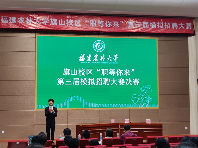 5月16日晚,旗山校区第三届“职等你来”模拟招聘大赛决赛在小报告厅举行。本次比赛由福建某地产集团人力资源中心人资经理卢学成,福州珍源康制药有限公司销售总监左利营,福建好搜信息技术有限公司福州区销售经理王明英,国家二级职业指导师方万春担任评委。校区两个学院近两百名学生观看了比赛。