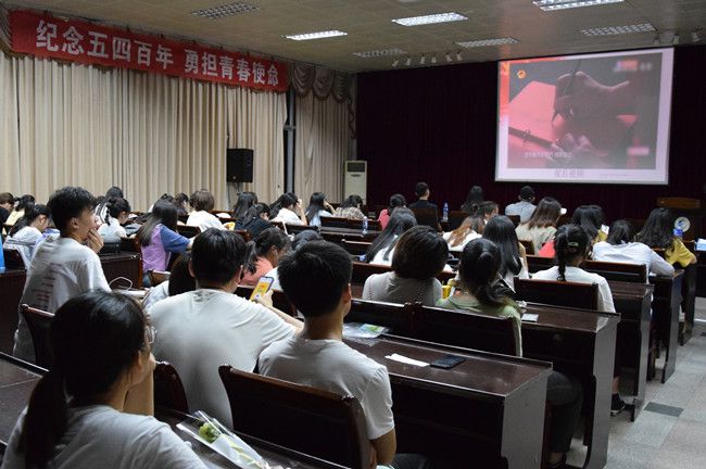5月17日晚,艺术园林学院于校大礼堂多功能厅开展以“纪念五四百年,勇担青春使命”为主题的道德讲堂活动。2018级辅导员张华荣、学生团总支书记何松岩以及各个专业学生代表约150余人参加活动。