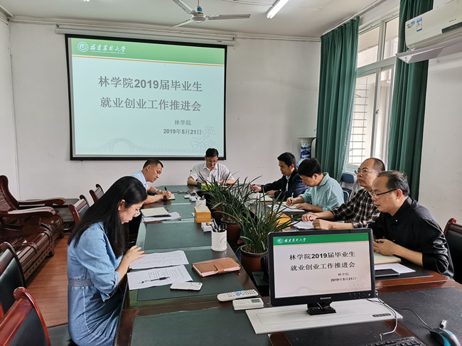 5月21日上午,林学院在石仓园3楼会议室召开2019届毕业生就业创业工作推进会,学院党委书记蓝天水、院长马祥庆、副书记黄文龙及全体政工干部参会,黄文龙主持会议。