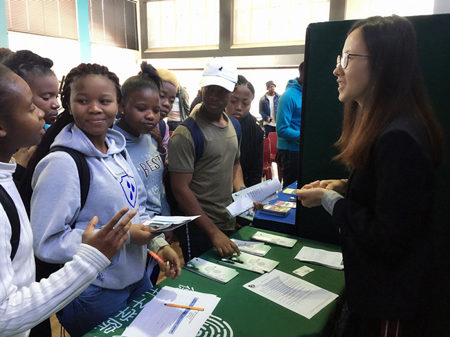 在留学中国展台前挤满了前来咨询的学生们,感兴趣的学生更是络绎不绝。不仅如此,留学中国宣讲教室内座无虚席,挤满了想要留学中国的学生们。德班孔院公派汉语教师雷妤从现代中国概况、中国高等教育现状、留学中国情况、奖学金类别、奖学金申请流程等方面详细介绍了留学中国项目,并重点介绍了孔子学院奖学金,同时,以我校招收外国来华留学生为例,详述了不同奖学金的申请方式与步骤。随后,就现场学生提出的疑惑与问题进行了一一解答。