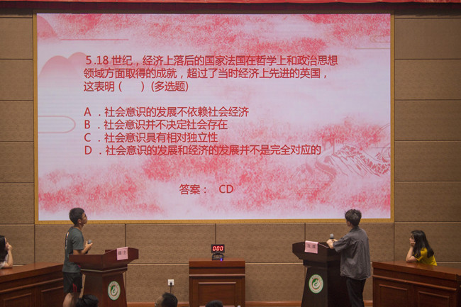 本次知识竞赛前期邀请马克思主义学院的专家对选手进行集中培训,并由学院采用笔试、现场竞技等多种形式从学院“海选”出40名选手进入复赛。最终,10名选手通过上周举行的复赛进入决赛现场。决赛分为风险答题和擂台对抗两个环节。在风险答题环节,每位选手从单选题、多选题和填空题三种题型中选择一种进行回答并计算得分。该环节进行了三轮,来自材料工程学院的黄晓同学答题累积取得领先优势,成为第二环节的擂主。在擂台对抗环节,其他九位选手轮流挑战擂主并争夺擂主之位,攻守双方答题激烈,现场气氛一度达到高潮。最终来自材料工程学院林智滨同学获得一等奖。