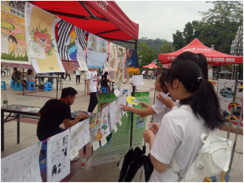 活动现场分为漫画展示区和游戏活动区,在漫画展示区中展示了向全校征集的心理漫画作品,由学生、评审老师进行投票评分,活动结束后将根据投票结果选出获奖作品。参展作品以轻松活泼的形式,展现大学生的快乐校园生活,折射出大学生面对学习和生活的积极心态。活动现场,风格各异的漫画作品吸引了许多老师、同学、游客驻足观看,并为喜欢的作品投票。而在心理小故事、心理拼图、看字读颜色、挑战文字乐等活动区,同学们也纷纷热情参与,这些活动区以娱乐的方式让大家敞开了心扉,参与互动,表达自我,展现自己。