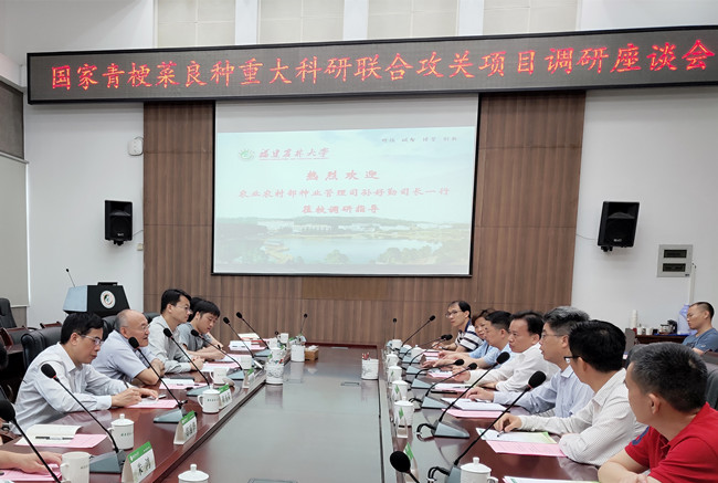 5月28日上午,国家农业农村部种业管理司副巡视员孙好勤、种业管理司品种创新处副处长陶伟国一行,在福建省农业农村厅副厅长陈东荣、省种子管理总站站长朱鸿,种业管理处处长郑钱华,省种子管理总站副站长张卫清等陪同下莅校调研“国家青梗菜良种重大科研联合攻关”项目进展。副校长郑宝东,科研院、园艺学院有关负责人及有关企业负责人等参加了调研座谈交流。