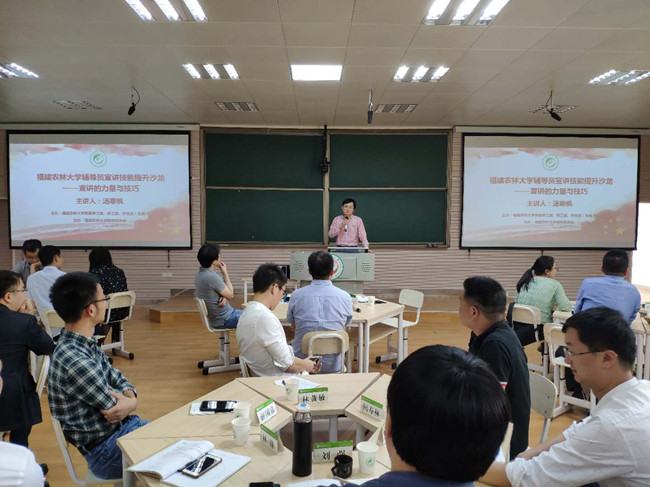 5月30日上午,我校在禧强楼207思政工作坊举办辅导员宣讲技能提升沙龙。沙龙邀请福建电视艺术家协会主持人专委会副秘书长、福州广播电视台播音部副主任、播音指导汤寒枫担任主讲嘉宾。校辅导员理论宣讲团成员、近两届校辅导员素质能力大赛获奖代表等30多人参加活动并与授课嘉宾现场互动交流。
