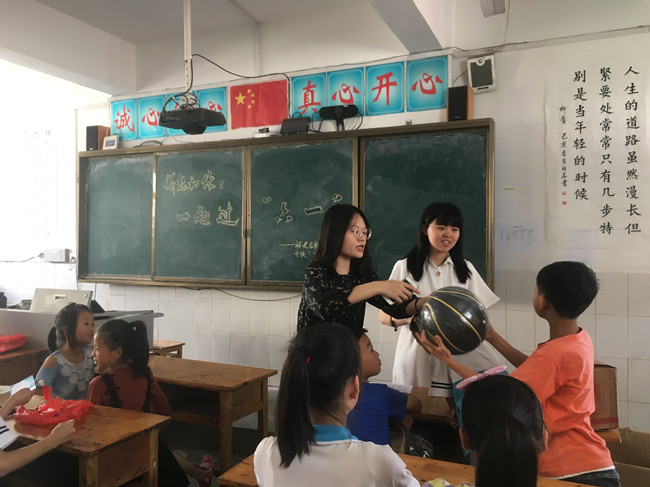 弥陀学校杨梦琪、周莹莹两位支教老师为孩子们分发礼物