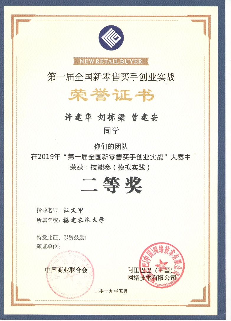 4月22日,由全国商业职业教育教学指导委员会指导、中国商业联合会共同主办,由阿里巴巴速卖通官方协办的《第一届全国新零售买手创业实战技能赛》正式开赛,本次赛程为期7天,最终,由我校安溪校区·安溪茶学院商务经济系陈佑成、江文甲老师指导、由商务经济系8名学生组成的两只队伍在第一届全国新零售买手创业实战技能赛双双斩获团队二等奖的好成绩,陈佑成老师和江文甲老师荣获优秀指导老师奖。