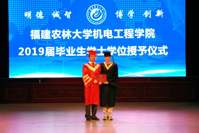 毕业典礼上还举行了毕业证书和学位证书颁发仪式,徐永依次为每位毕业生援正流苏、颁发毕业证书和学位证书,并合影留念。