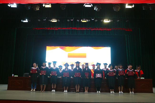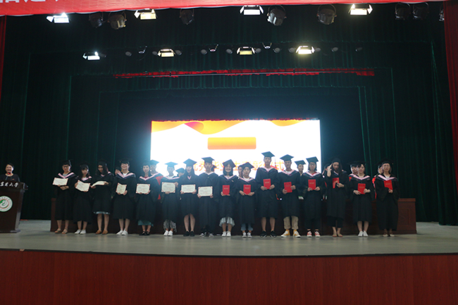 在学士学位授予仪式上,主席台上的领导老师为每一位毕业生援正流苏、颁发毕业证书和学位证书,并合影留念。伴随着慷慨激昂的校歌声,毕业典礼圆满结束。