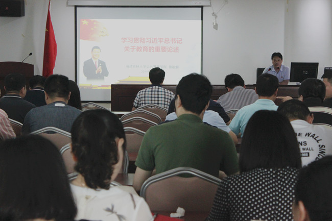 6月20日下午,公共管理学院开展全国教育大会精神专题宣讲报告会,学院党委书记曾起郁作主题为“学习贯彻习近平总书记关于教育的重要论述”的宣讲报告,学院全体教师和学生党员参加报告会。