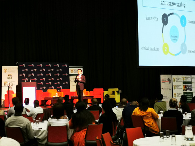 德班理工大学孔子学院中方院长吴林在大学生创新创业论坛中做了题为“从南非走向中国”的主旨演讲,为大学生创业者们讲述了现代中国的风采以及高速发展的中国经济发展中面临的机遇与挑战,介绍了中国新四大发明以及潜在的创新创业机会,鼓励在场的年轻创业者以孔院为平台,通过“汉语+”职业技能培训等特色化发展道路,开启通往中国的大门,建立与中国企业、与中国市场之间的联系,成为推动中南两国之间友好合作的民间大使,同时也为解决南非年轻人就业问题注入新的动力。
