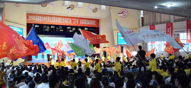 “青春心向党,建功新福建”。6月28日上午,2019年福建省大中专学生志愿者暑期文化科技卫生“三下乡”社会实践活动启动仪式在我校大学生活动中心礼堂举行。团省委书记肖华鑫、省文旅厅巡视员吴立官、省委教育工委副巡视员叶灵、省农村信用社联合社副主任刘爱晖、团省委副书记陈志勇、校党委副书记曾华平,以及省委宣传部、省委文明办、省河长办、省学联、人民日报数字传播福建公司等有关单位负责人,17所高校师生代表共700多人参加启动仪式。