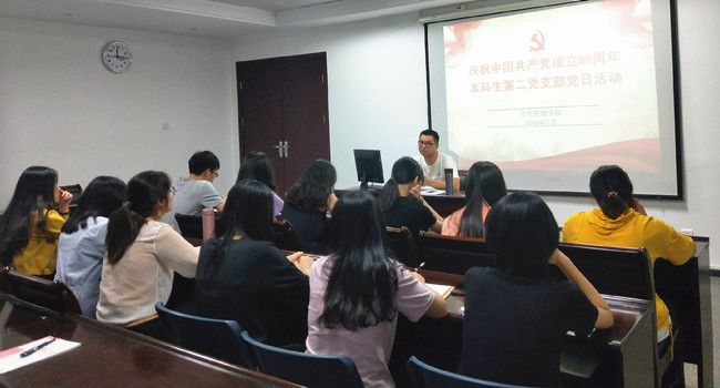建党98周年到来之际,7月3日下午,公共管理学院本科生第二党支部在公管楼203教室开展庆祝中国共产党成立98周年党日活动。活动由支部书记王彬彬主持。2016级、2017级学生党员参加活动。