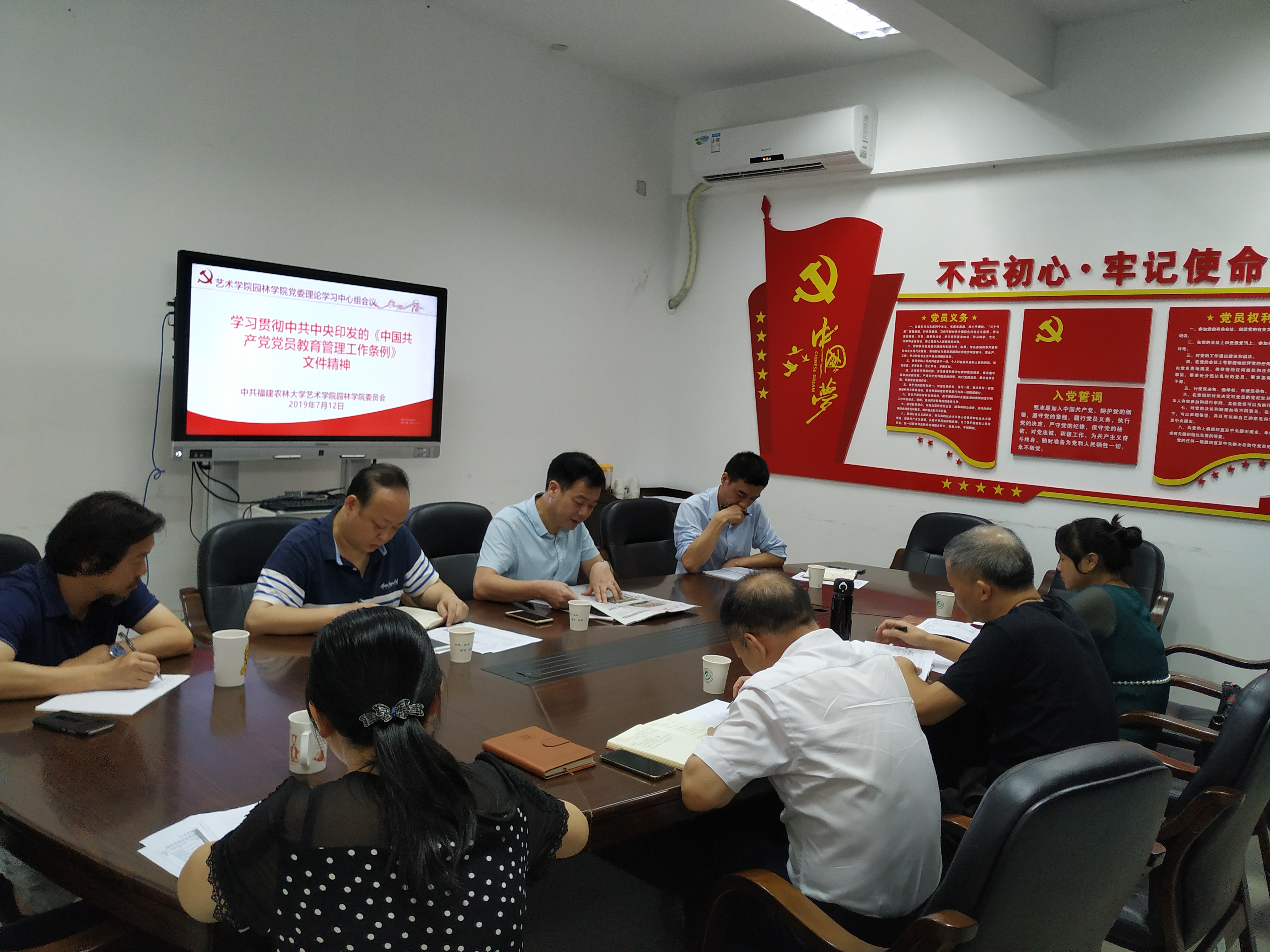 7月12日上午,艺术学院园林学院党委书记陈为德同志主持召开学院党委理论学习中心组会议,专题学习中共中央印发的《中国共产党党员教育管理工作条例》 (以下简称《条例》),学习贯彻习近平同志在深化党和国家机构改革总结会议上的讲话精神。院长张飞萍、院党委副书记曹伟、副院长黄启堂、丁铮、陈祖建、陈小英出席会议。