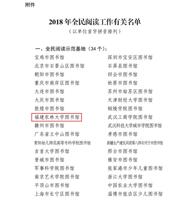 “全民阅读示范基地”是中国图书馆学会系列全民阅读工作层次最高的称号,要求两次以上进入优秀组织或先进单位名单。我校图书馆分别于2013年、2015年进入中国图书馆学会“全民阅读先进单位”名单,经过图书馆持续努力更上一层楼,终于进入2018年“全民阅读示范基地”名单。据悉,全国共有34个图书馆进入2018年“全民阅读示范基地”名单,其中高校图书馆8个。