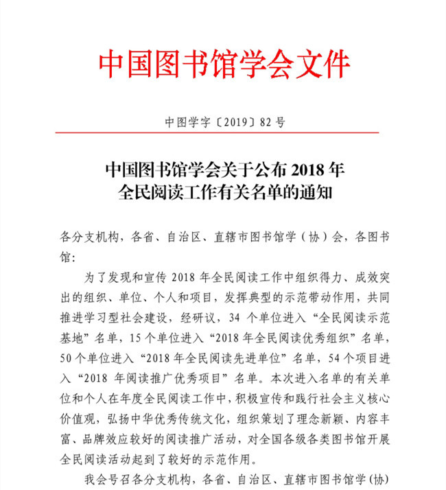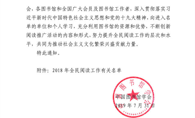 7月31日,据《中国图书馆学会关于公布2018年全民阅读工作有关名单的通知》文件,我校图书馆进入中国图书馆学会“全民阅读示范基地”名单。