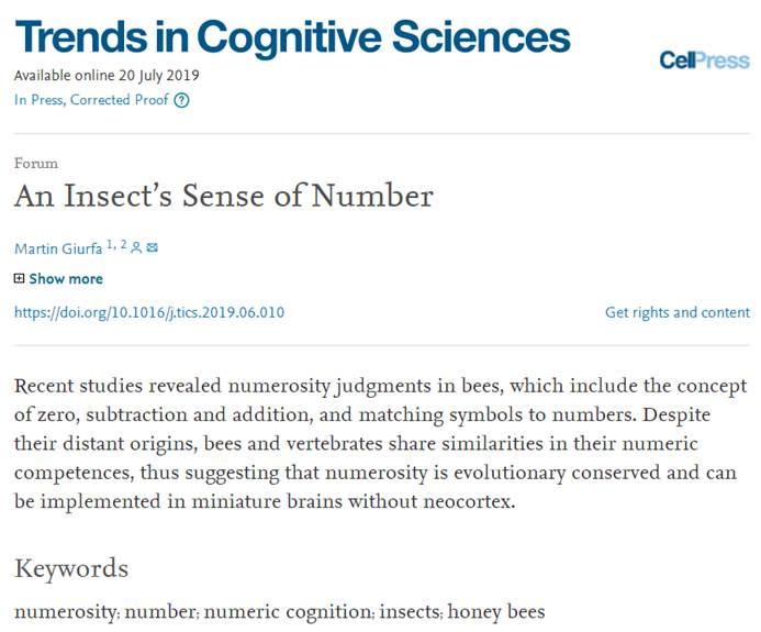 近日,我校蜂学学院柔性引进特聘教授Martin Giurfa在行为科学国际一流学术期刊《Trends in Cognitive Sciences》发表了题为“An Insect’s Sense of Number”(昆虫的数字感觉认知)的前瞻性综述论文。《Trends in Cognitive Sciences》是行为科学研究领域最具影响力的学术刊物之一,2018年影响因子为16.173,主要发表行为科学领域权威科学家的综述论文,对该领域的现状和未来进行评述,在学术界具有重要影响。开云网页版蜂学学院是该论文的第一单位。