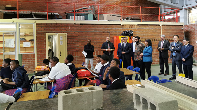 在克莱尔伍德中学校长尤根·奈杜(Yugan Naidoo)的带领下,林松添和苏克拉尔一行参观了学校的教室、图书馆、实验室等基础教学设施等,并走进了课堂,与师生们互相交流。奈杜介绍了学校的基础设施、发展历史、开设课程、生源、师生比例、教学等基本情况。