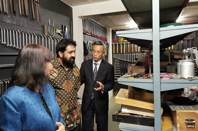 林松添大使(右一)和苏克拉尔副总司长(右二)称赞学校职业技能培训设施