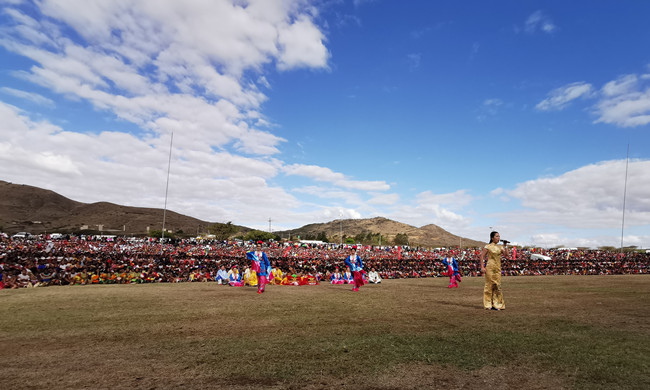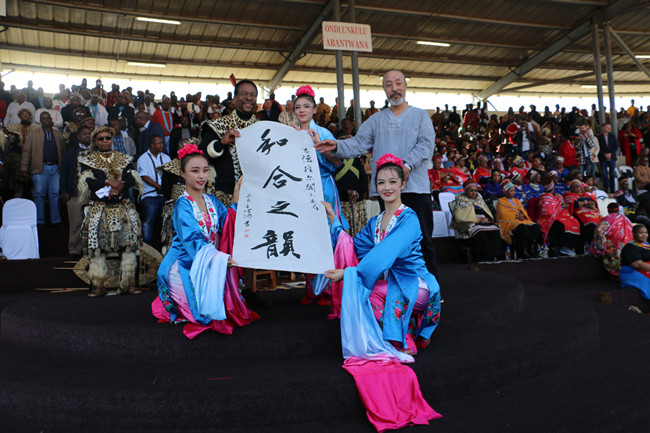 当地时间9月7日,南非夸纳省农戈马市(Nongoma)的祖鲁王尤肯尼(Nyokeni)王宫里,五万多名祖鲁少女载歌载舞共同庆贺祖鲁人一年一度最负盛名、最盛大的传统节日——芦苇节。而今年的芦苇节,在中国驻德班总领事馆和德班理工大学孔子学院的精心安排下,南非祖鲁大地上首次迎来了一批来自遥远东方的神秘客人——浙江师范大学的艺术团。他们为祖鲁王古德维尔·兹维里提尼(Goodwill Zwelithini)和其族民们献上了一场精彩绝伦的中华传统文化表演,让“和而不同·和合之美”的优美旋律在在祖鲁大地唱响。